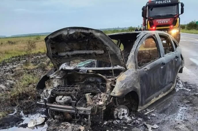 Debido al fuerte impacto, el rodado se incendió por completo en la banquina, provocando daños materiales totales. Las llamas incluso se extendieron hacia pastizales cercanos al lugar. Afortunadamente, los ocupantes no sufrieron lesiones de gravedad y fueron asistidos en el lugar del hecho.