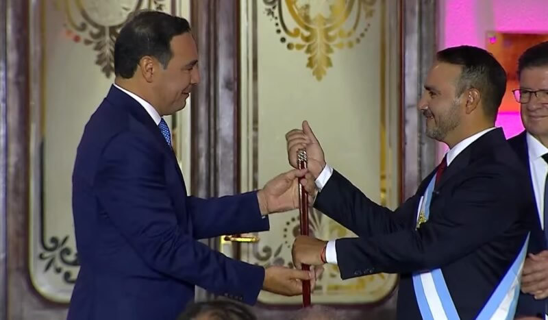 La banda y el bastón de mando le fueron entregados al nuevo mandatario por su hermano y gobernador saliente, Gustavo Valdés, con el acompañamiento de su madre, Juana Victoria Mosqueda.