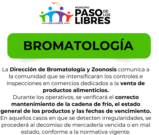 La Municipalidad de Paso de los Libres, a través de la Dirección de Bromatología y Zoonosis, informa a la comunidad que se intensificarán los controles e inspecciones en los comercios dedicados a la venta de productos alimenticios, con el objetivo de resguardar la salud pública y garantizar la seguridad alimentaria.