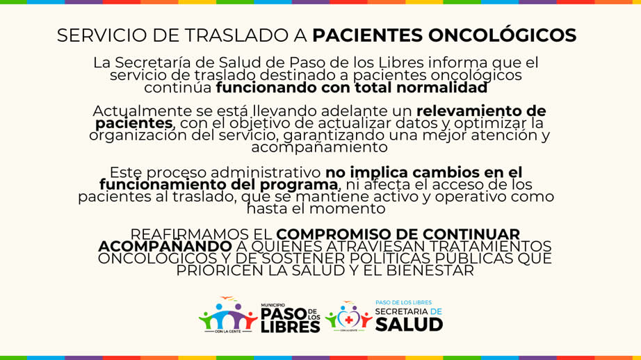 La Municipalidad de Paso de los Libres informa que el servicio de traslado destinado a pacientes oncológicos continúa funcionando con total normalidad, sin registrarse modificaciones ni suspensiones en el programa.