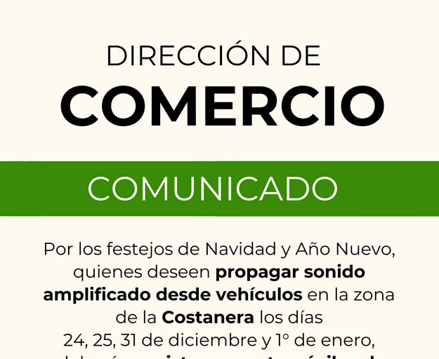 La Municipalidad de Paso de los Libres, a través de la Dirección de Comercio, informa que toda persona interesada en propagar sonido amplificado mediante su vehículo en la zona de la costanera local durante los días 24, 25, 31 de diciembre y 1 de enero, deberá registrar previamente su automóvil ante la oficina administrativa del área.
