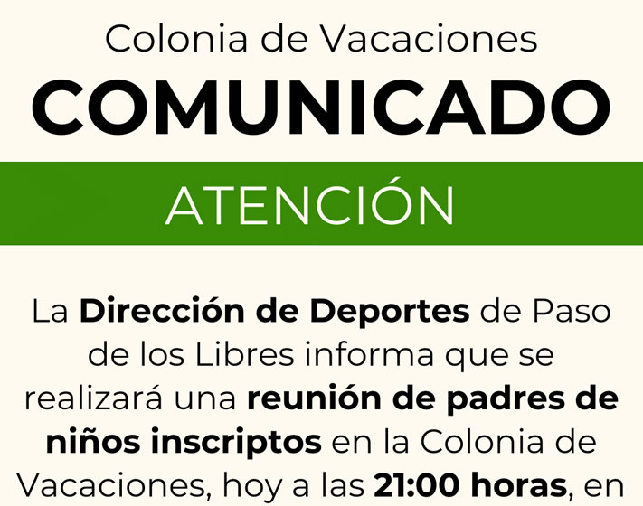 La Dirección de Deportes de Paso de los Libres informa que se realizará una reunión de padres de niños inscriptos en la Colonia de Vacaciones, hoy a las 21:00 horas, en el Polideportivo Diego Armando Maradona.