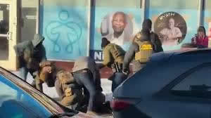 En las imágenes se ve a media docena o más de agentes enmascarados rodeando a un hombre que forcejea con ellos y parece resistirse en el suelo.