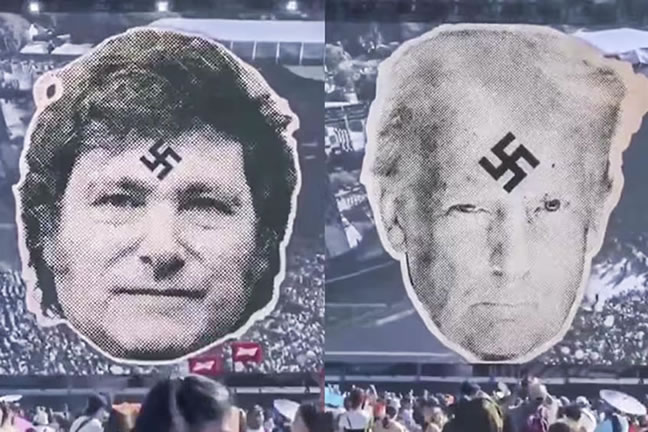 La secuencia apareció mientras el grupo interpretaba “Ultraderecha”, una canción del histórico conjunto chileno Los Prisioneros, conocida por su fuerte contenido crítico. En las visuales se veían fotografías del presidente argentino Javier Milei, del mandatario estadounidense Donald Trump y del primer ministro israelí Benjamin Netanyahu con una esvástica dibujada en la frente. También apareció una imagen del político chileno José Antonio Kast intervenida de la misma manera.